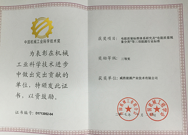 近日,從中國(guó)機(jī)械工業(yè)聯(lián)合會(huì)獲悉,威勝能源參與申報(bào)的《能源電能質(zhì)量標(biāo)準(zhǔn)體系研究及“電能質(zhì)量現(xiàn)象分類”等三項(xiàng)能源行業(yè)標(biāo)準(zhǔn)》項(xiàng)目榮獲中國(guó)機(jī)械科學(xué)技術(shù)獎(jiǎng)三等獎(jiǎng),該獎(jiǎng)是我國(guó)機(jī)械行業(yè)權(quán)威科技獎(jiǎng)項(xiàng)之一。