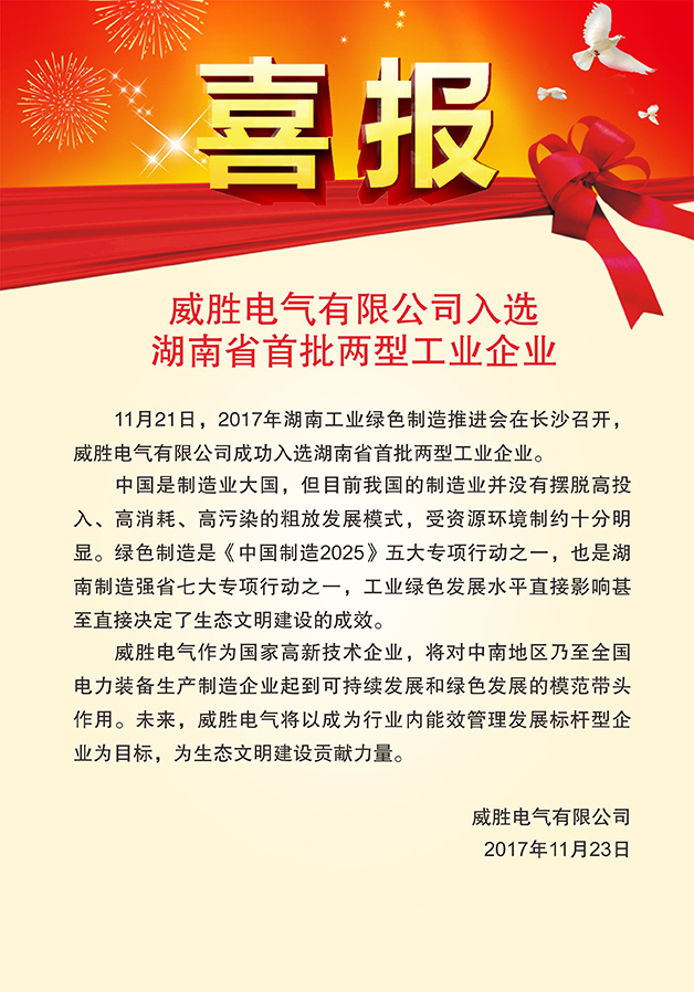 11月21日,2017年湖南工業(yè)綠色制造推進會在長沙召開,威勝電氣有限公司成功入選湖南省首批兩型工業(yè)企業(yè)。