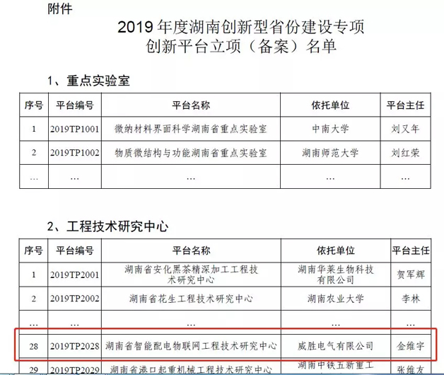 近日,湖南省科學技術廳下發(fā)了《關于2019年度湖南創(chuàng)新型省份建設專項創(chuàng)新平臺立項(備案)的通知》。威勝電氣憑借“智能配電物聯(lián)網關鍵技術研究制造”獲批省級工程技術研究中心 。這是威勝電氣在獲得湖南省企業(yè)技術中心后取得的又一重要殊榮。