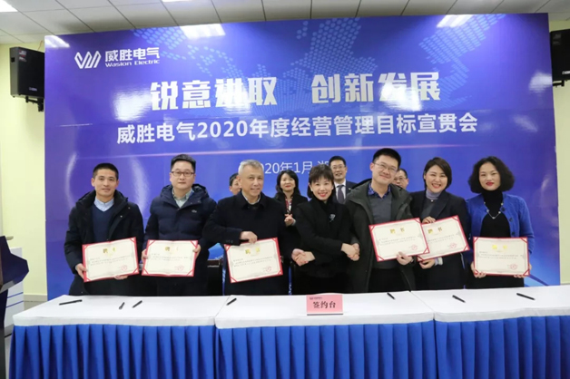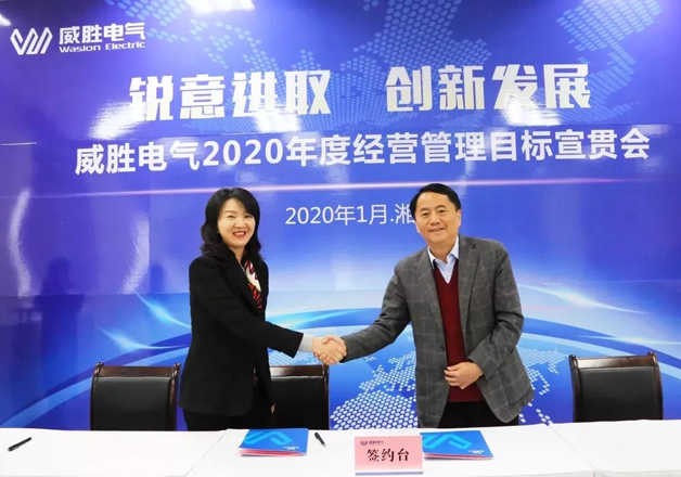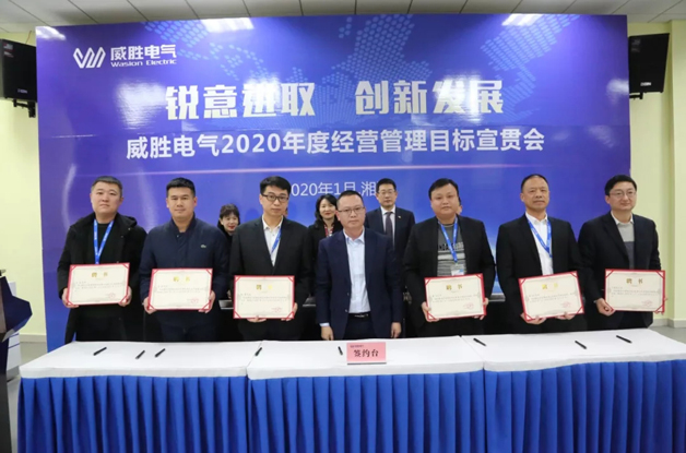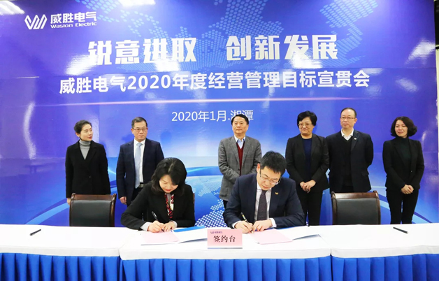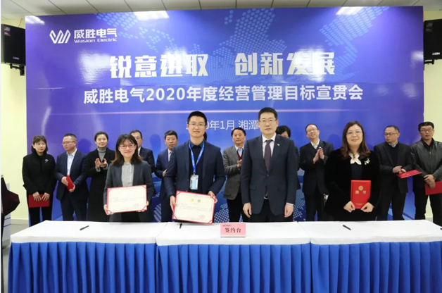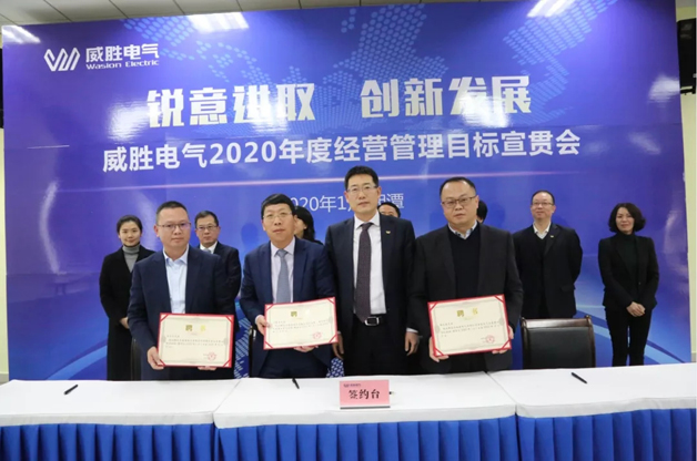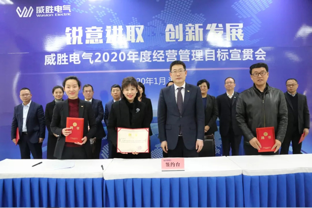 威勝電氣總裁曾辛先生鄭重向電氣董事長曹總簽署2020年目標(biāo)承諾書