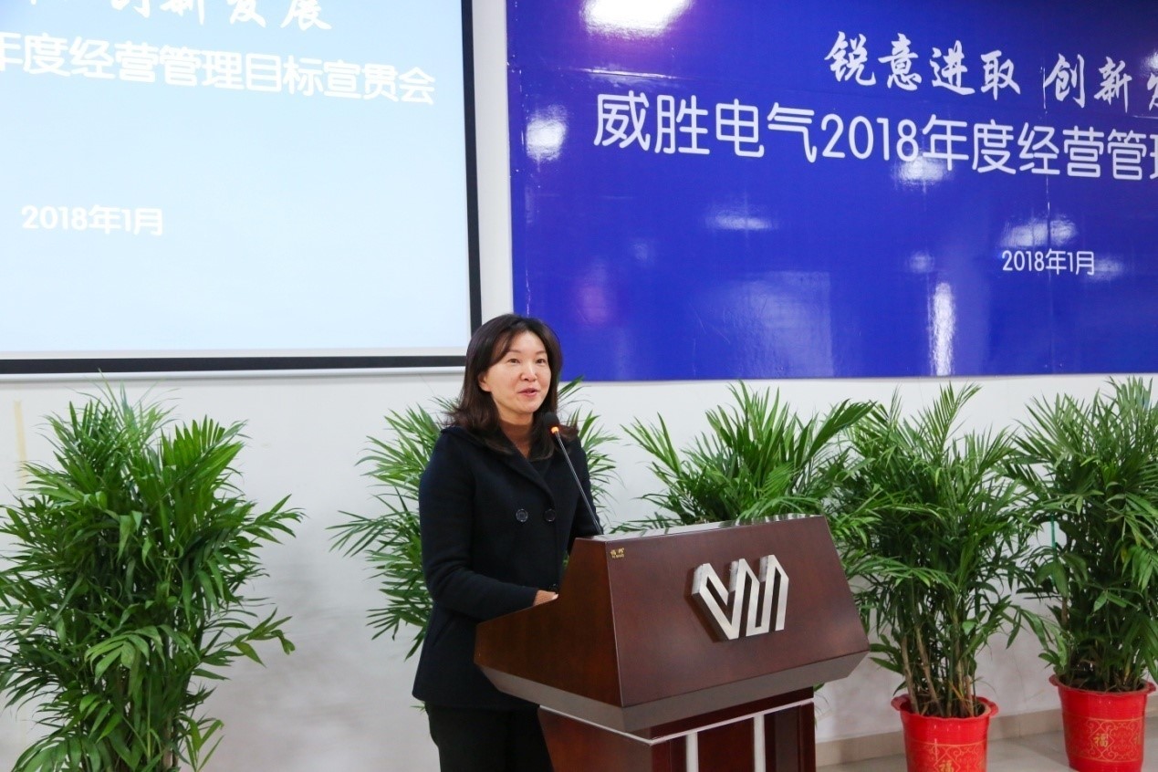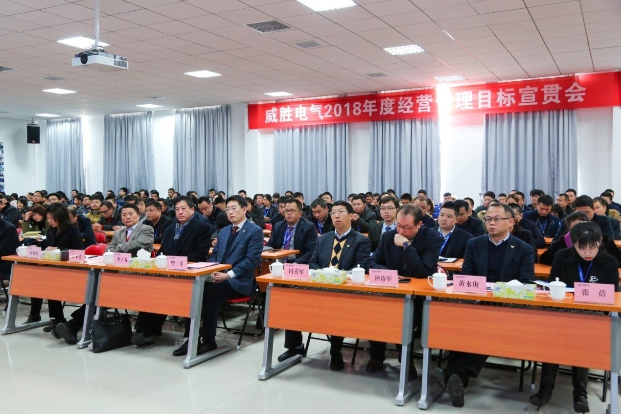 2018年1月8日下午,以“銳意進取,創(chuàng)新發(fā)展”為主題的威勝電氣2018年經(jīng)營管理目標宣貫會在電氣產(chǎn)業(yè)園會議中心培訓(xùn)室順利召開??毓啥聲飨?、控股本部、威勝電氣董事會以及經(jīng)營管理團隊的各位領(lǐng)導(dǎo)、威勝電氣員工代表共計260余人參加了本次會議,會議由威勝電氣行政人事總監(jiān)鄧超艷女士主持。