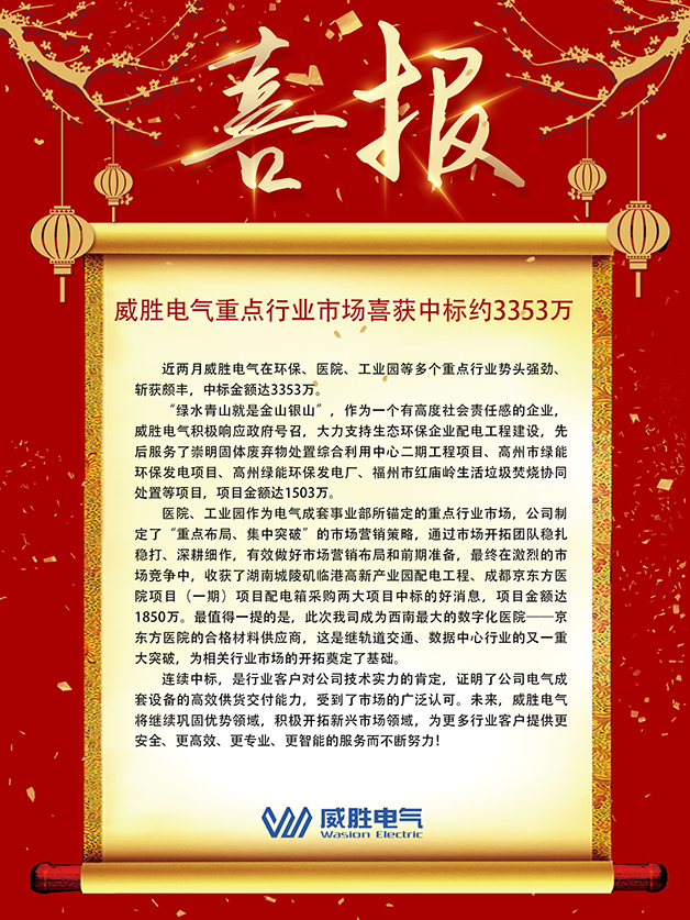 連續(xù)中標(biāo),是行業(yè)客戶對公司技術(shù)實力的肯定,證明了公司電氣成套設(shè)備的高效供貨交付能力,受到了市場的廣泛認可。未來,威勝電氣將繼續(xù)鞏固優(yōu)勢領(lǐng)域,積極開拓新興市場領(lǐng)域,為更多行業(yè)客戶提供更安全、更高效、更專業(yè)、更智能的服務(wù)而不斷努力!