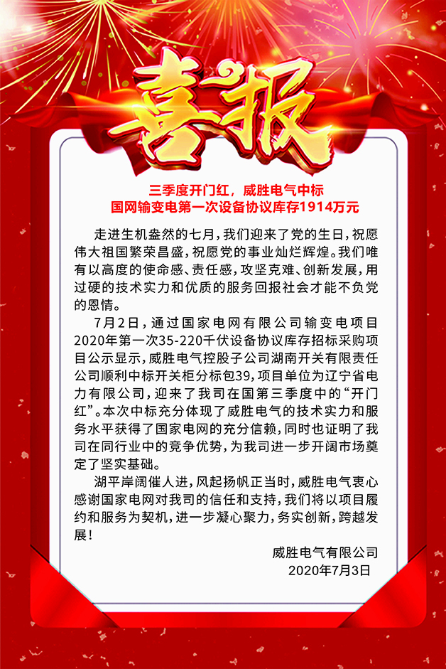 7月2日,通過國家電網(wǎng)有限公司輸變電項(xiàng)目2020年第一次35-220千伏設(shè)備協(xié)議庫存招標(biāo)采購項(xiàng)目公示顯示,威勝電氣控股子公司湖南開關(guān)有限責(zé)任公司順利中標(biāo)開關(guān)柜分標(biāo)包39,項(xiàng)目單位為遼寧省電力有限公司,迎來了我司在國第三季度中的“開門紅”。本次中標(biāo)充分體現(xiàn)了威勝電氣的技術(shù)實(shí)力和服務(wù)水平獲得了國家電網(wǎng)的充分信賴,同時(shí)也證明了我司在同行業(yè)中的競爭優(yōu)勢,為我司進(jìn)一步開闊市場奠定了堅(jiān)實(shí)基礎(chǔ)。