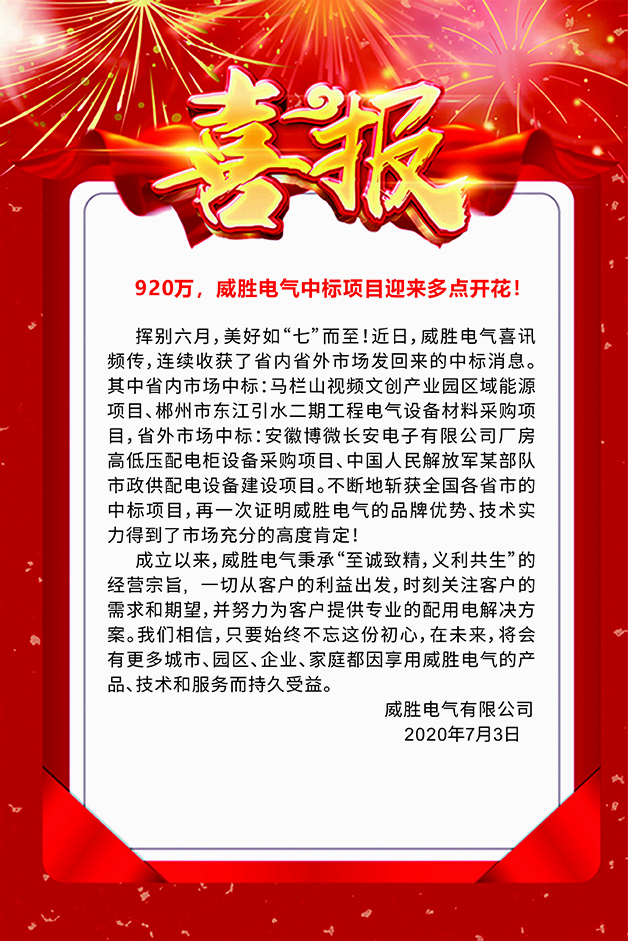 揮別六月,美好如“七”而至!近日,威勝電氣喜訊頻傳,連續(xù)收獲了省內(nèi)省外市場(chǎng)發(fā)回來(lái)的中標(biāo)消息。其中省內(nèi)市場(chǎng)中標(biāo):馬欄山視頻文創(chuàng)產(chǎn)業(yè)園區(qū)域能源項(xiàng)目、郴州市東江引水二期工程電氣設(shè)備材料采購(gòu)項(xiàng)目,省外市場(chǎng)中標(biāo):安徽博微長(zhǎng)安電子有限公司廠房高低壓配電柜設(shè)備采購(gòu)項(xiàng)目、中國(guó)人民解放軍某部隊(duì)市政供配電設(shè)備建設(shè)項(xiàng)目。不斷地?cái)孬@全國(guó)各省市的中標(biāo)項(xiàng)目,再一次證明威勝電氣的品牌優(yōu)勢(shì)、技術(shù)實(shí)力得到了市場(chǎng)充分的高度肯定!