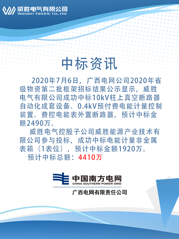 2020年7月6日,廣西電網(wǎng)公司2020年省級物資第二批框架招標(biāo)結(jié)果公示顯示,威勝電氣有限公司成功中標(biāo)10kV柱上真空斷路器自動化成套設(shè)備、0.4kV預(yù)付費電能計量控制裝置、費控電能表外置斷路器,預(yù)計中標(biāo)金額2490萬。