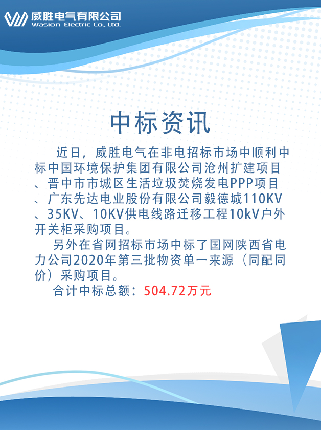 近日,威勝電氣在非電招標(biāo)市場(chǎng)中順利中標(biāo)中國環(huán)境保護(hù)集團(tuán)有限公司滄州擴(kuò)建項(xiàng)目、晉中市市城區(qū)生活垃圾焚燒發(fā)電PPP項(xiàng)目、廣東先達(dá)電業(yè)股份有限公司毅德城110KV、35KV、10KV供電線路遷移工程10kV戶外開關(guān)柜采購項(xiàng)目。