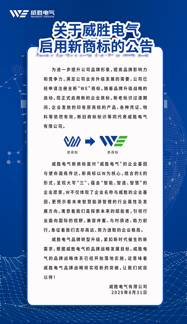 為進(jìn)一步提升公司品牌形象,提高品牌影響力和競(jìng)爭(zhēng)力,滿足公司業(yè)務(wù)升級(jí)發(fā)展的需要,公司已經(jīng)申請(qǐng)注冊(cè)全新“WE”商標(biāo)。隨著品牌升級(jí)戰(zhàn)略的啟動(dòng),現(xiàn)正式啟用新的企業(yè)商標(biāo),新老標(biāo)識(shí)過(guò)渡期間,企業(yè)發(fā)放的印有原商標(biāo)的產(chǎn)品、各種憑證、物料等依然有效,新舊商標(biāo)標(biāo)識(shí)等同代表威勝電氣有限公司。