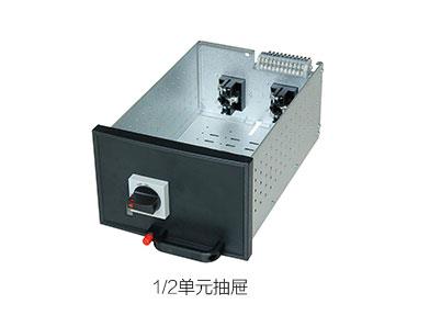 該柜型抽出式功能單元外形尺寸標(biāo)準(zhǔn)化程度高,高度尺寸采用25模數(shù)值,可組裝成高度為150、200、300、400、60O等模數(shù)值內(nèi)的單元抽屜。1/2單元抽屜配套使用電路分配轉(zhuǎn)接器,可以制作高度為150、200的小單元抽屜。